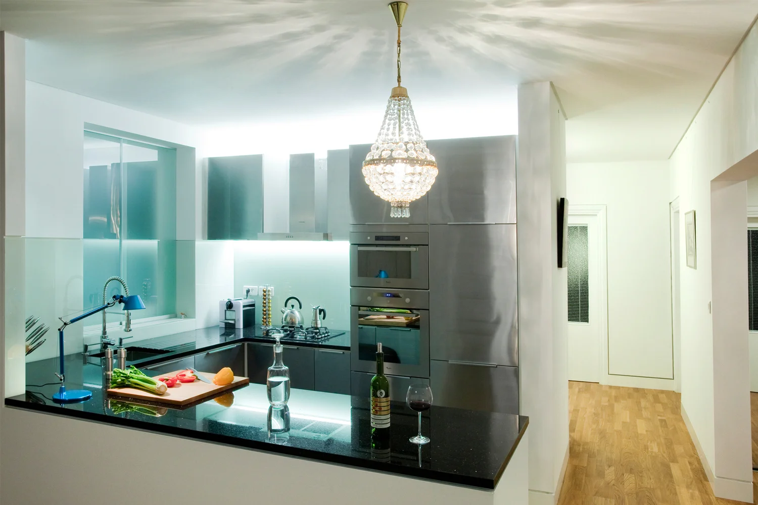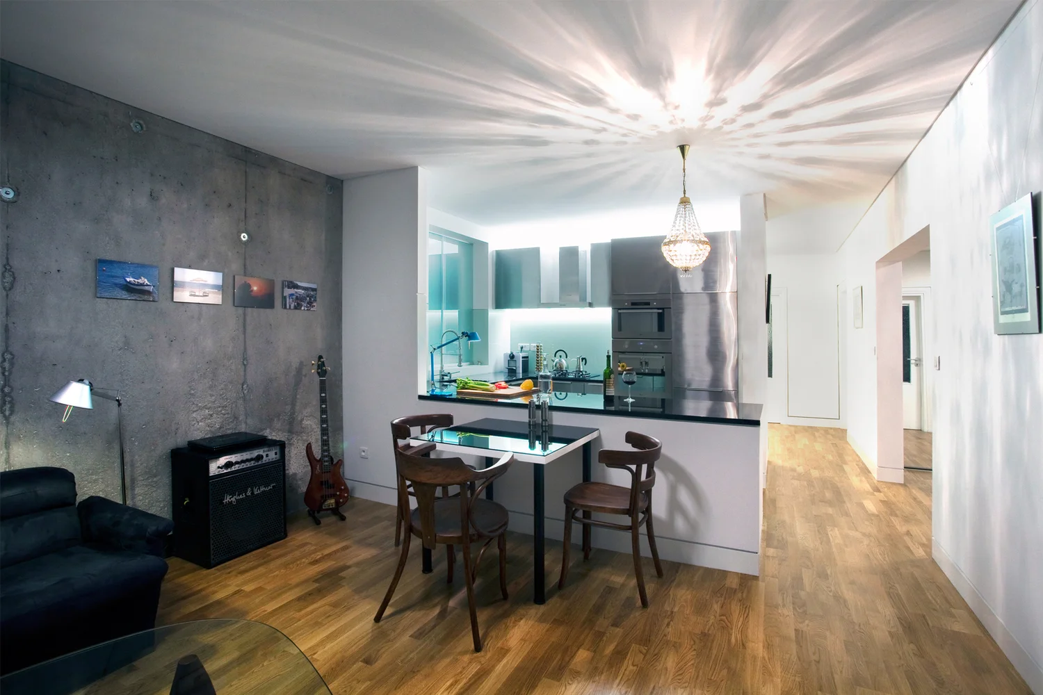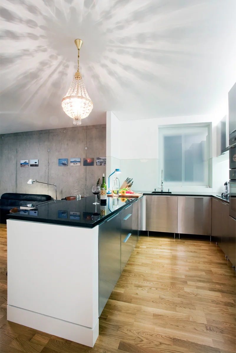 Dominantnými prvkami obytnej zóny sú kuchynská linka z nehrdzavejúcej ocele a obnažená pôvodná betónová stena. Svojou drsnou krásou zaujímavo kontrastuje hladkými plochami skla, nerezi a lešteného kameňa. Interiér je dotiahnutý do detailov – styk stien s podlahami a so stropmi je riešený zapustenou fugou, ktorá sa objavuje aj pri zárubniach a v zóne kuchyne..