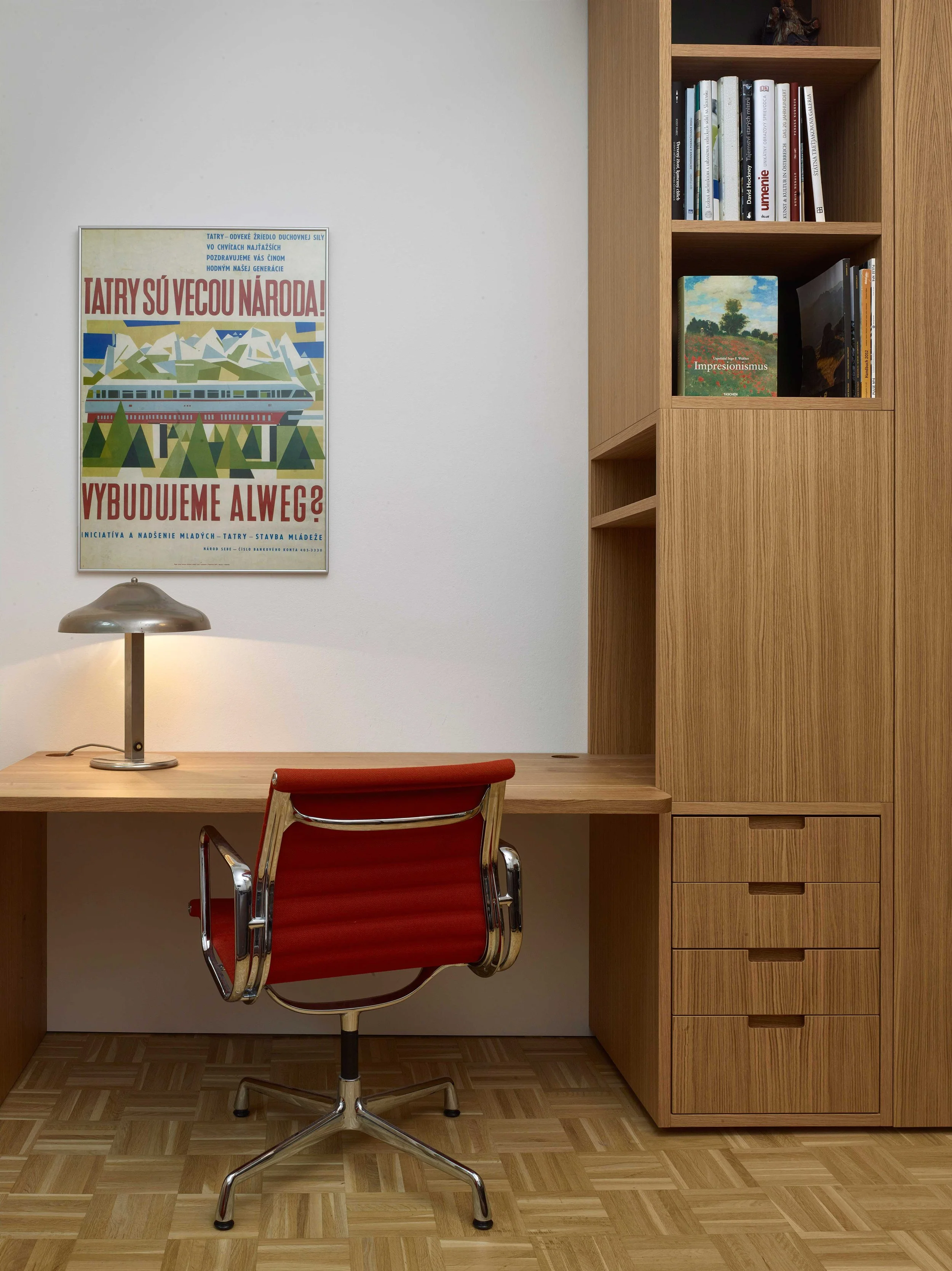 Nové, na mieru navrhované prvky majú v celom byte jednotný ráz – opakuje sa tu prírodné dubové drevo, výška vstavaných elementov až po strop priestoru, rovnaký dizajn madiel. Autori ich pri návrhu premyslene kombinujú so staršími kúskami – ako sú repasované Thonet kreslá v obývačke, historická skriňa v spálni, alebo luster v detskej izbe, ktoré jednak presviedčajú, že sa architekti neboja kombinovať prvky rôznych období, a jednak tým vyvolávajú pocit, že byt je nielen nadčasový, ale bude vedieť dôstojne starnúť.