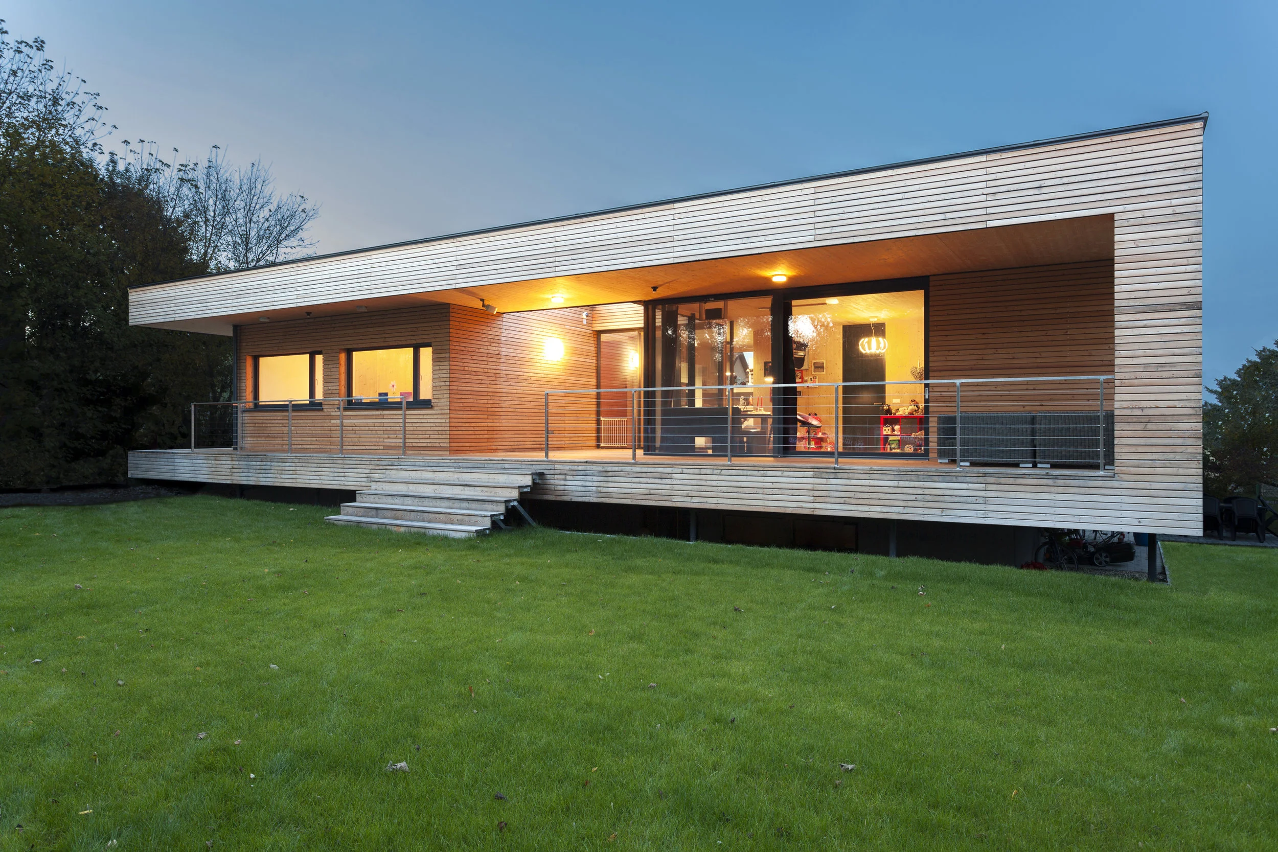 Silná idea konceptu je podporená premysleným konštrukčným a materiálovým riešením: obytné podlažie je drevenou konštrukciou, ktorej vlastnosti spĺňajú kritéria nízkoenergetickej stavby. Tá sa „vznáša“ nad menším betónovým suterénom, v ktorom sú skryté technické priestory a garáž. Návrh vystihujú poctivé detaily a priznané materiály: nosná drevená stropná doska zostáva v interiéri obnažená a plynule prechádza na loggiu, liata industriálna podlaha dodáva priestoru príjemnú drsnosť. Vďaka preskleniam na celú výšku obytné priestory plynule prechádzajú do záhrady a átria.