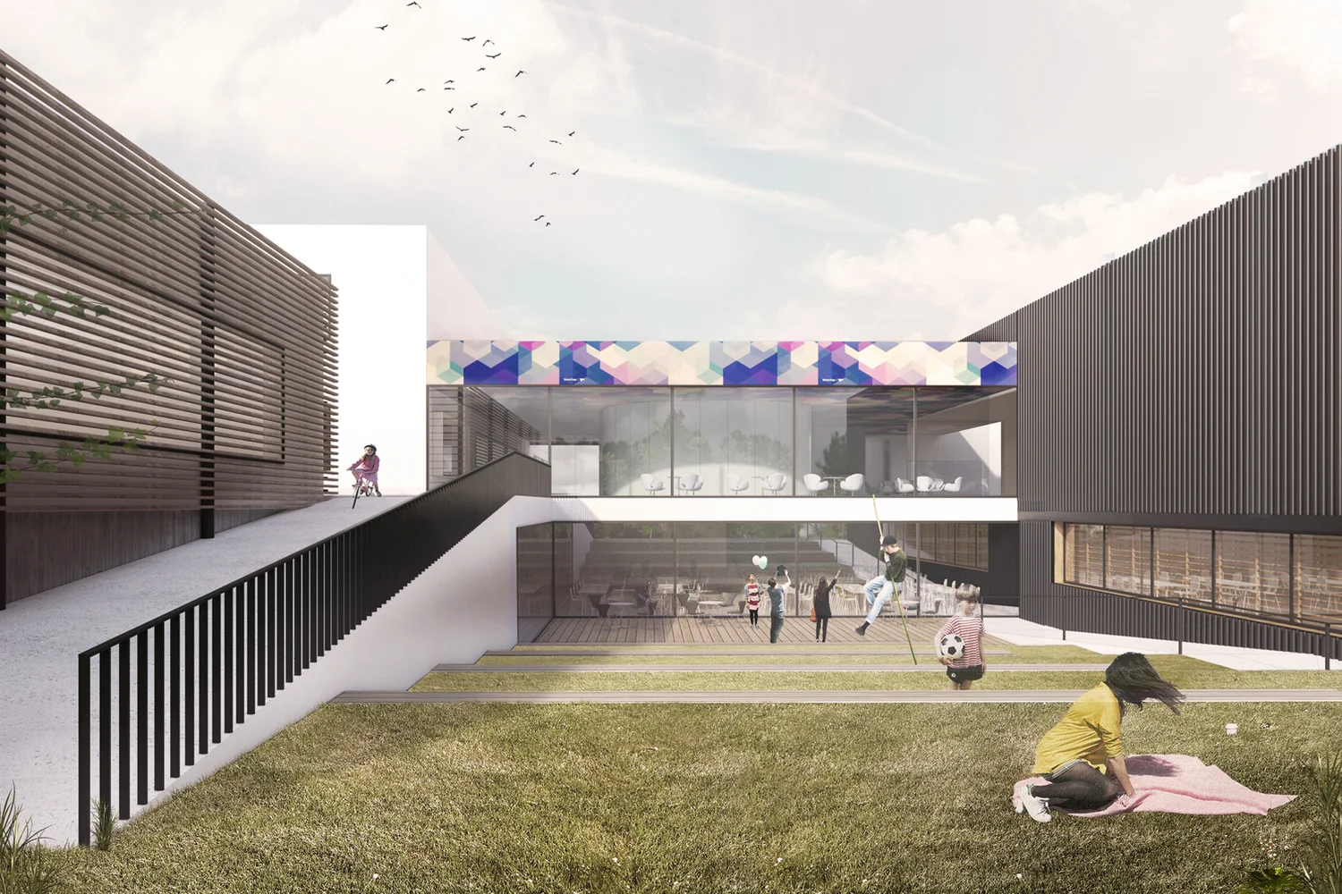Všetky triedy majú nablízku exteriérovú plochu - obidva vyučovacie pavilóny majú v úrovni 2. NP výbeh na detský dvor na streche centrálnej haly. Je tu navrhnutá farebná detská krajina z mäkkej hmoty, na ktorej môžu deti relaxovať a hrať sa s výhľadom do okolia. Jej súčasťou sú plochy pre vonkajšie vyučovanie s možnosťou prekrytia pergolou.