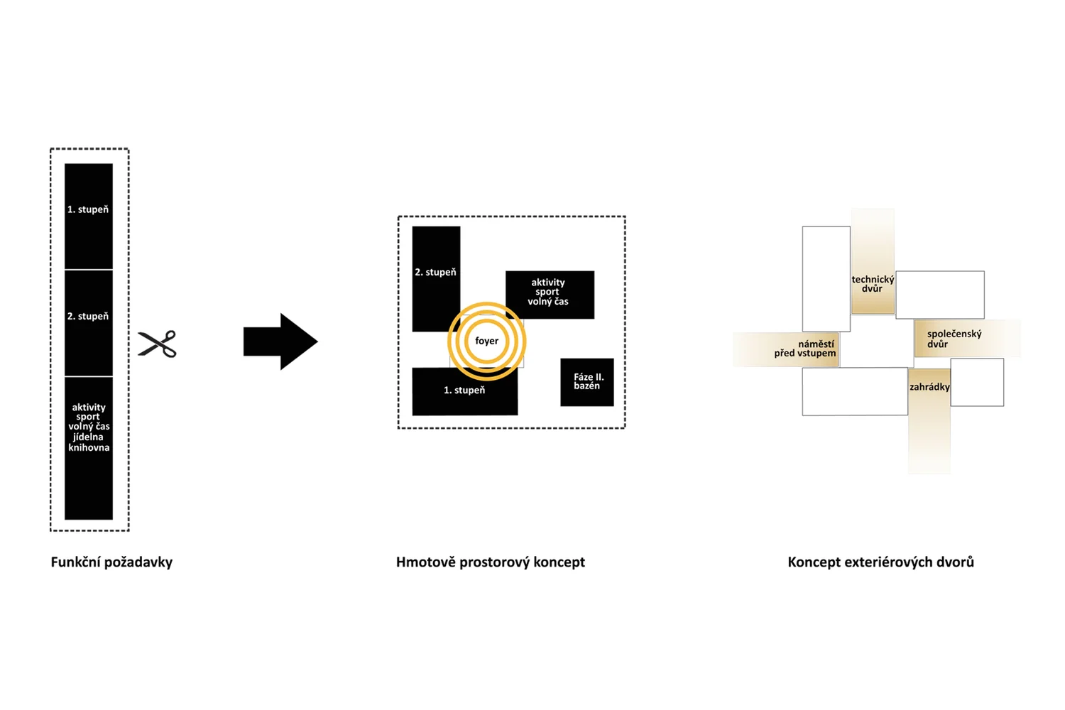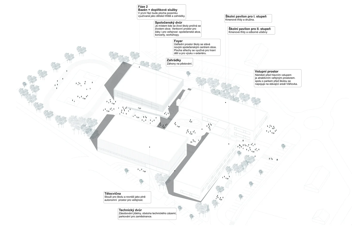 Rozmiestnenie funkcií na pozemku vychádza z kontextu obce a pracuje s daným terénom. Pavilóny s triedami I. a II. stupňa sú situované ku plánovanej príjazdovej komunikácii a orientujú sa ku obci. Objekty telocvične a bazéna tvoria väčšie stavebné objemy, preto sú umiestnené vovnútri areálu a čiastočne zapustené do terénu, ktorý sa tu zvažuje.