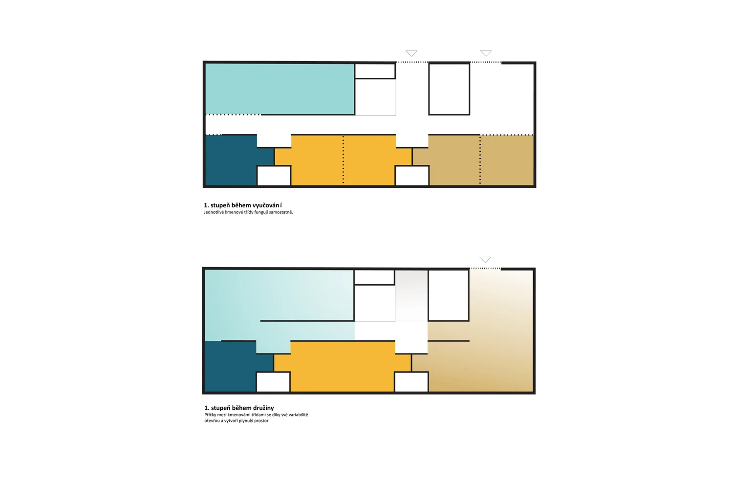 Dispozícia školy jasne odčleňuje prevádzky I. a II. stupňa. Prípravka a kmeňové triedy I. stupňa sú štvorcového pôdorysu, čo umožňuje ich variabilitu. Ku každej z nich patrí relaxačná zóna a priestor na hranie. Medzi triedami sú kabinety, ktoré súčasne slúžia pre individuálnu starostlivosť o dieťa, príp. rodiča (psychológ). Chodba so zálivmi a zónou na hranie je otvoreným presvetleným priestorom, komunikujúcim s triedami. Družina bude na 1.NP, kde sa z tried a priestrannej chodby dá vytvoriť spoločný priestor s ostrovmi na hranie. Šatne pre I. stupeň sú riešené na chodbách jednotlivo ku každej triede, nie sú uzamykateľné.