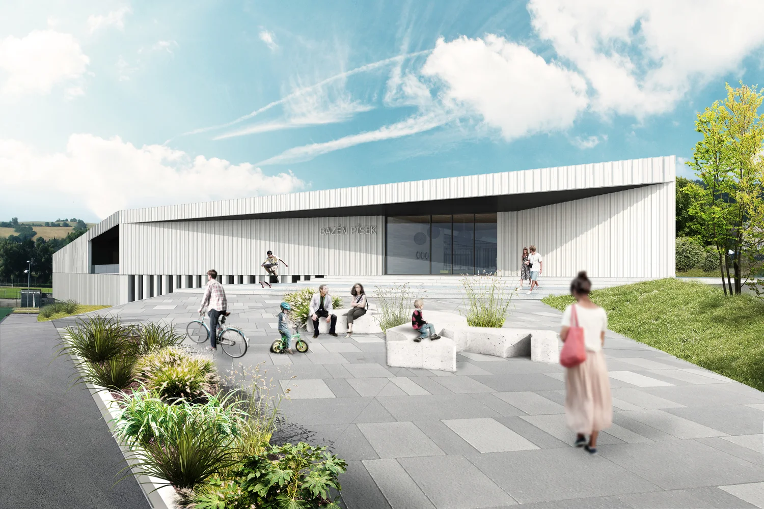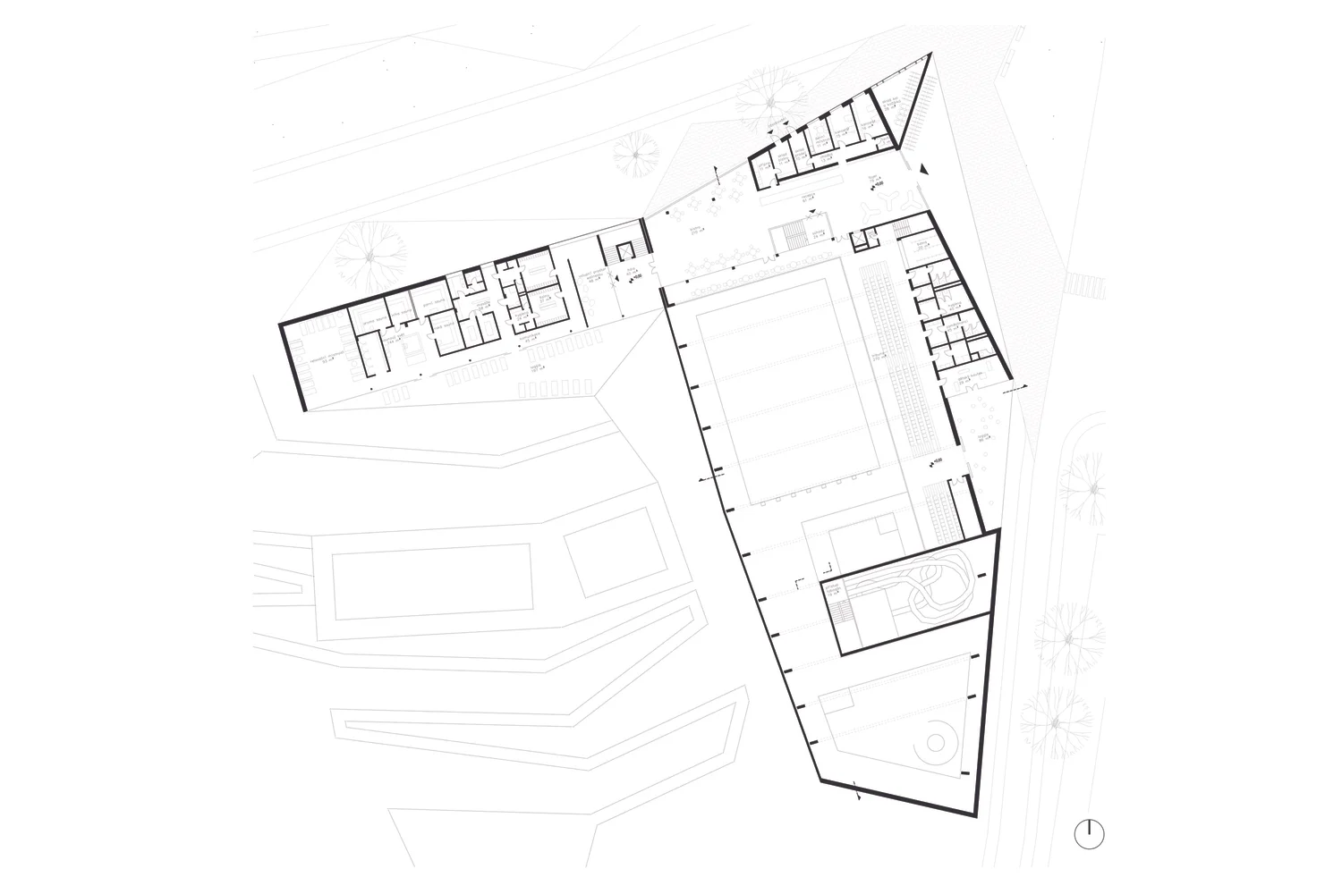 Urbanistická koncepcia je kompaktná a jasne čitateľná, čo prispieva k optimalizácii prevádzky a stavebných náklado. Vo vzťahu k mestu sa stavba javí ako významný objekt, ktorý čistým a dynamickým architektonickým výrazom primerane signalizuje športovo - rekreačný charakter.