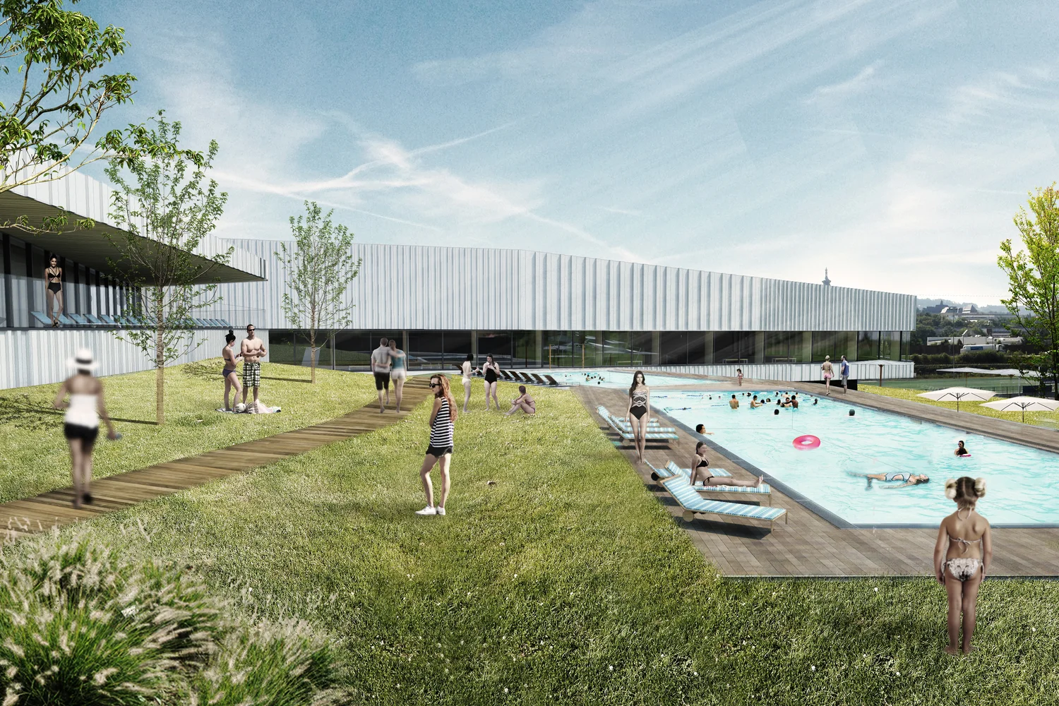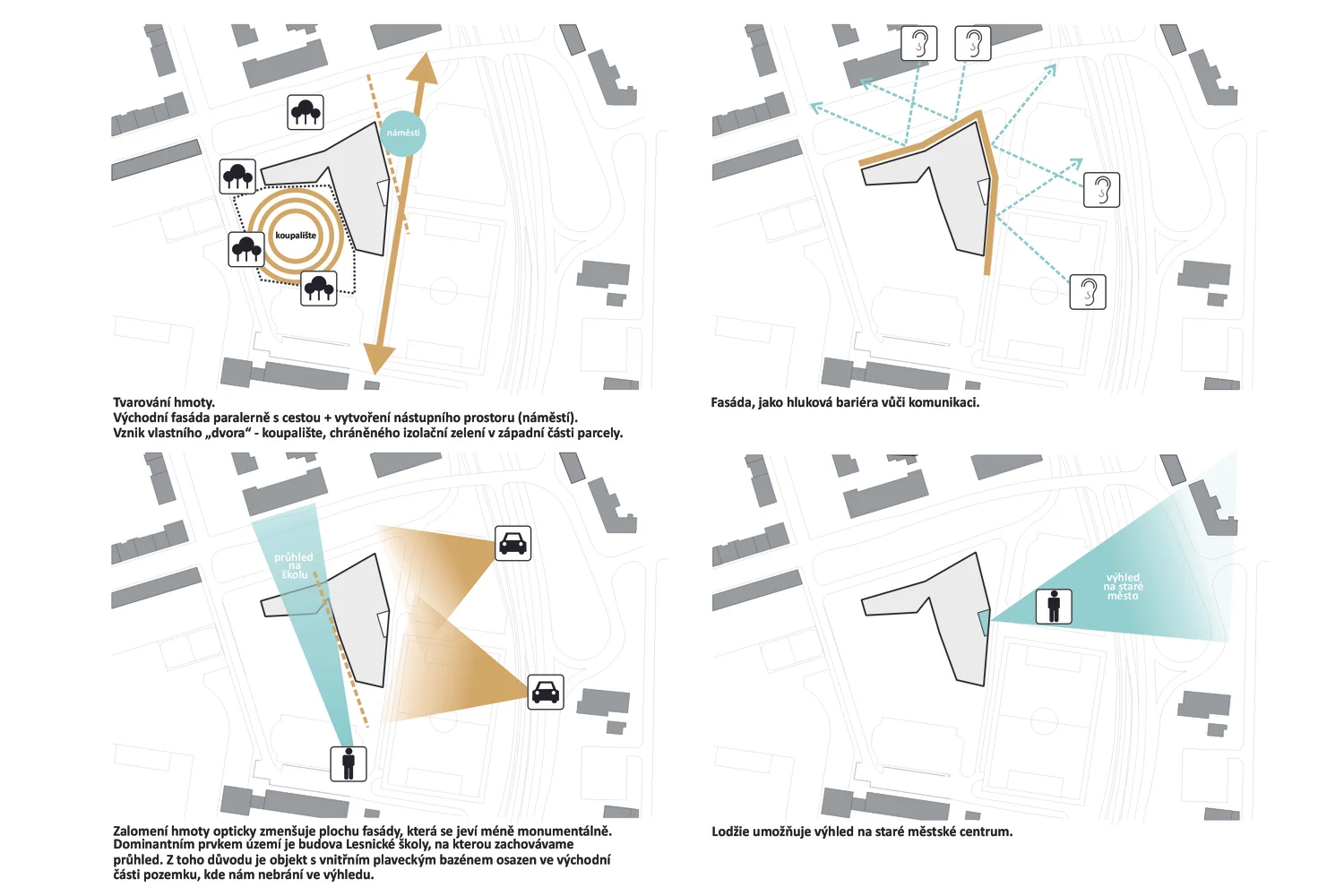 Hmota stavby je tvarovaná a osadená v prostredí tak, aby mala v jednotlivých pohľadových uhloch príjemné merítko a aby rešpektovala morfológiu terénu. Veľký objem plavárne je súčasne bariérou od dopravnej tepny a železnice. Menšia hmota wellness svojou výškou umožňuje pohľad na dominantu územia - Lesnícku školu, čím zachováva kontinuitu v prostredí.