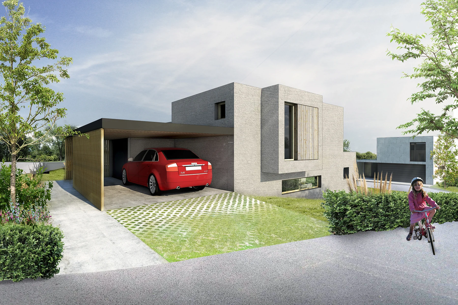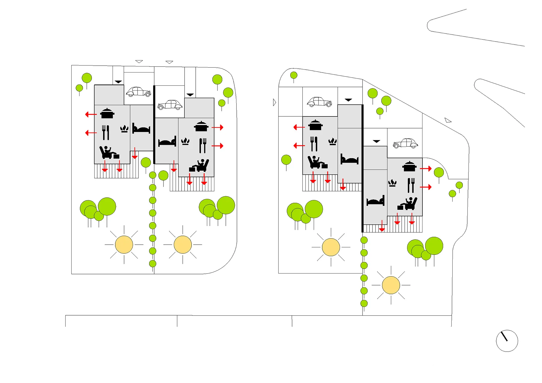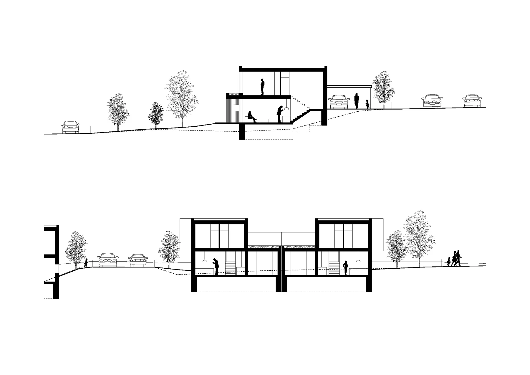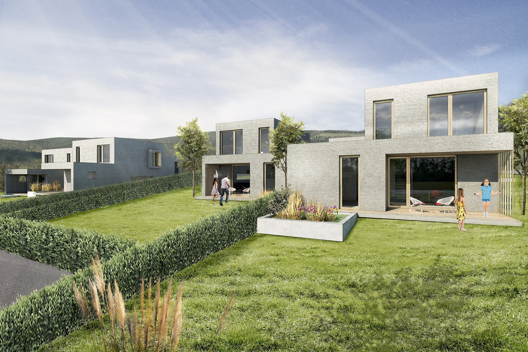 Navrhujeme celkovo sedem rodinných domov (tri rodinné domy a dva dvojdomy) v mierne svahovitom teréne. V relatívne hustej zástavbe rodinného bývania je najdôležitejšou témou zachovanie súkromia pre obyvateľov jednotlivých domov. Hmoty dvojdomov sú vzájomne vyposúvané tak, aby tu vznikali zóny súkromia a aby sa ľudia na terasách navzájom nerušili. Aj hmoty rodinných domov sme vytvarovali tak, aby mal každý dom vlastnú, nerušenú exteriérovú zónu. Ide o murované domy, ktoré sú omietnuté špeciálne štrukturovanou a vzorovanou omietkou. Drevené okná a drevené prvky na terasách a prístreškoch dodávajú tejto architektúre príjemnú atmosféru rodinného bývania.
