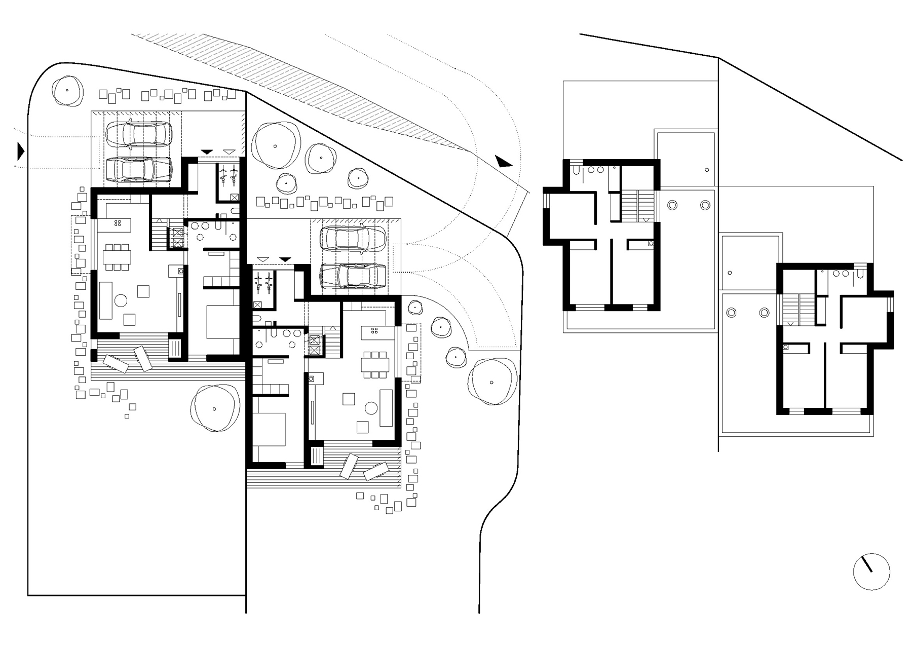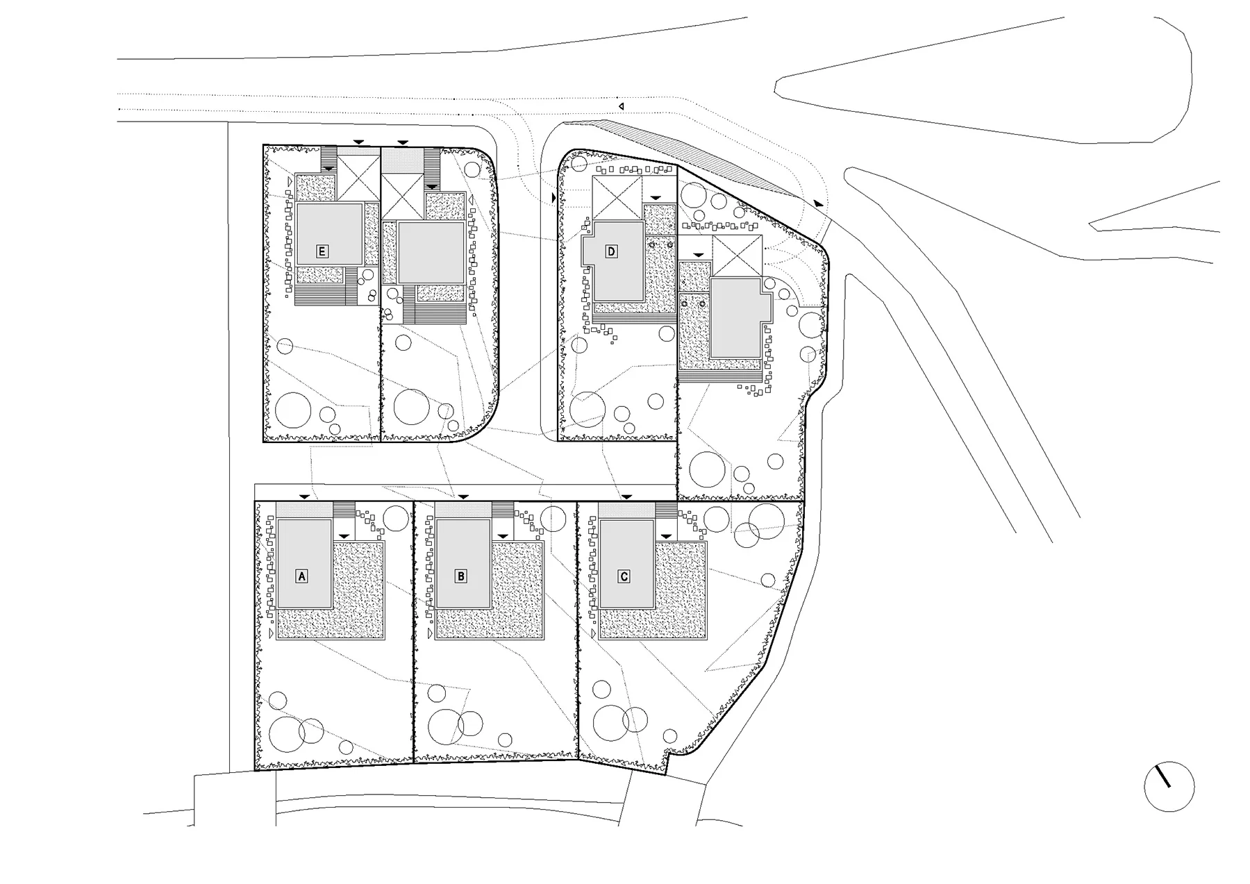 Navrhujeme celkovo sedem rodinných domov (tri rodinné domy a dva dvojdomy) v mierne svahovitom teréne. V relatívne hustej zástavbe rodinného bývania je najdôležitejšou témou zachovanie súkromia pre obyvateľov jednotlivých domov. Hmoty dvojdomov sú vzájomne vyposúvané tak, aby tu vznikali zóny súkromia a aby sa ľudia na terasách navzájom nerušili. Aj hmoty rodinných domov sme vytvarovali tak, aby mal každý dom vlastnú, nerušenú exteriérovú zónu. Ide o murované domy, ktoré sú omietnuté špeciálne štrukturovanou a vzorovanou omietkou. Drevené okná a drevené prvky na terasách a prístreškoch dodávajú tejto architektúre príjemnú atmosféru rodinného bývania.