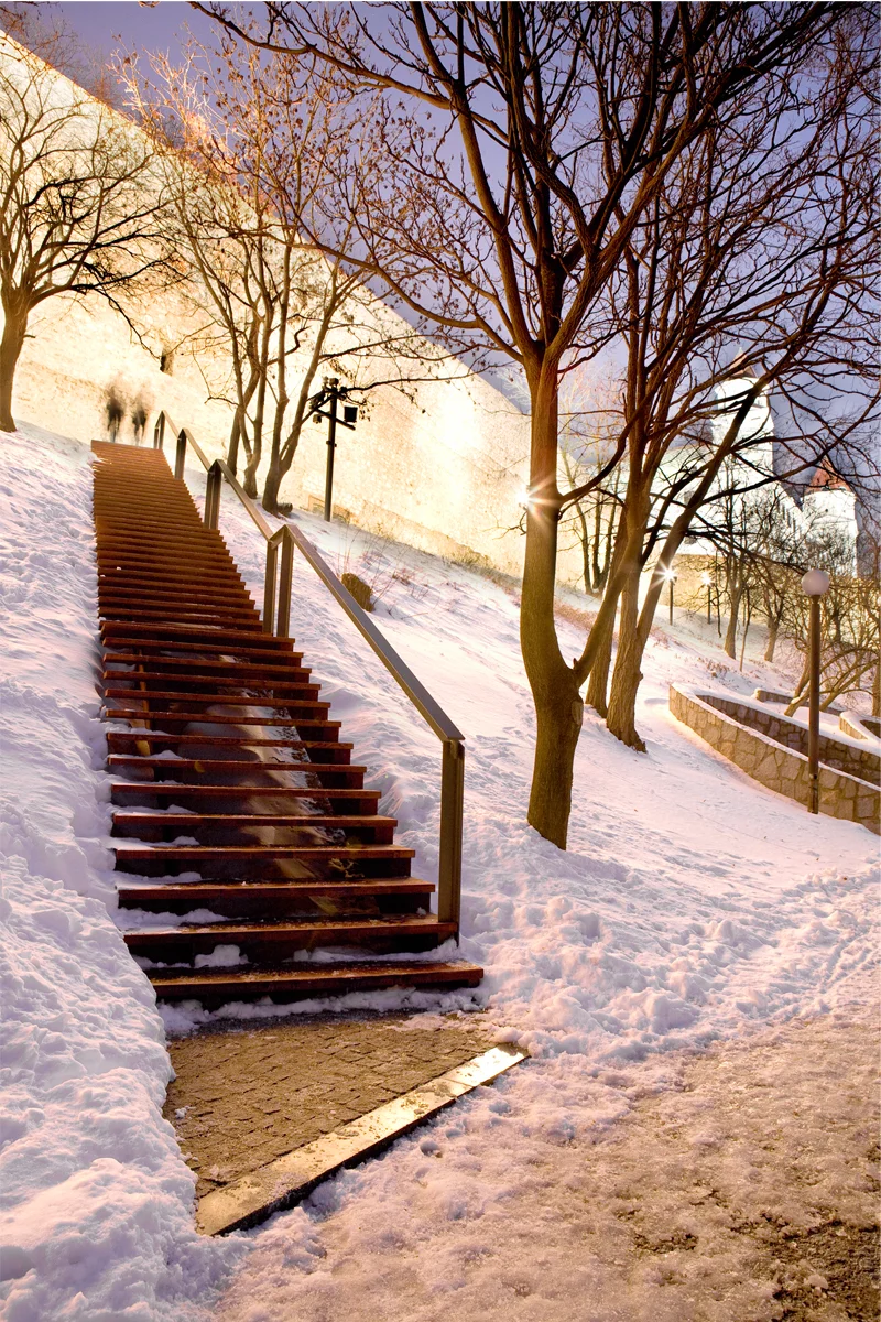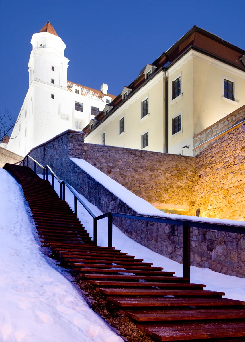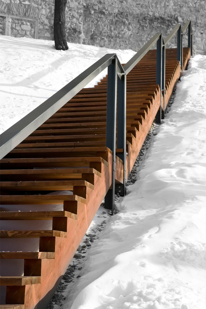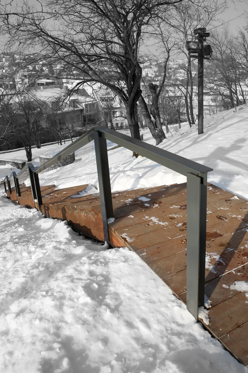 Schody na hradnom vrchu dotvárajú chýbajúcu časť pešej promenády okolo hradieb. ARCHITEKTI mikulaj & mikulajová navrhli dvojicu drevených schodísk, ktoré spája štrkový chodník pre peších vedený popri hradnom múre.