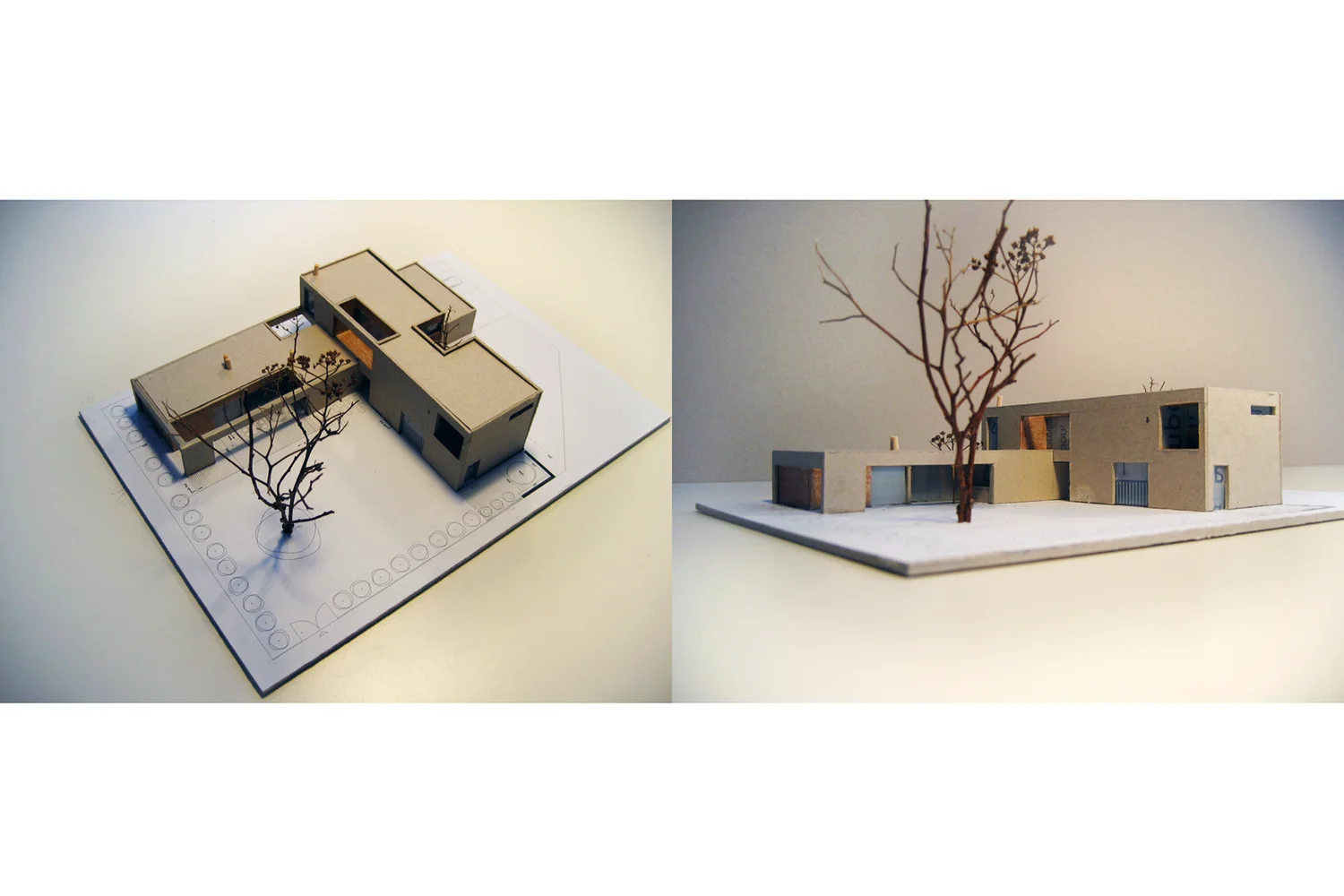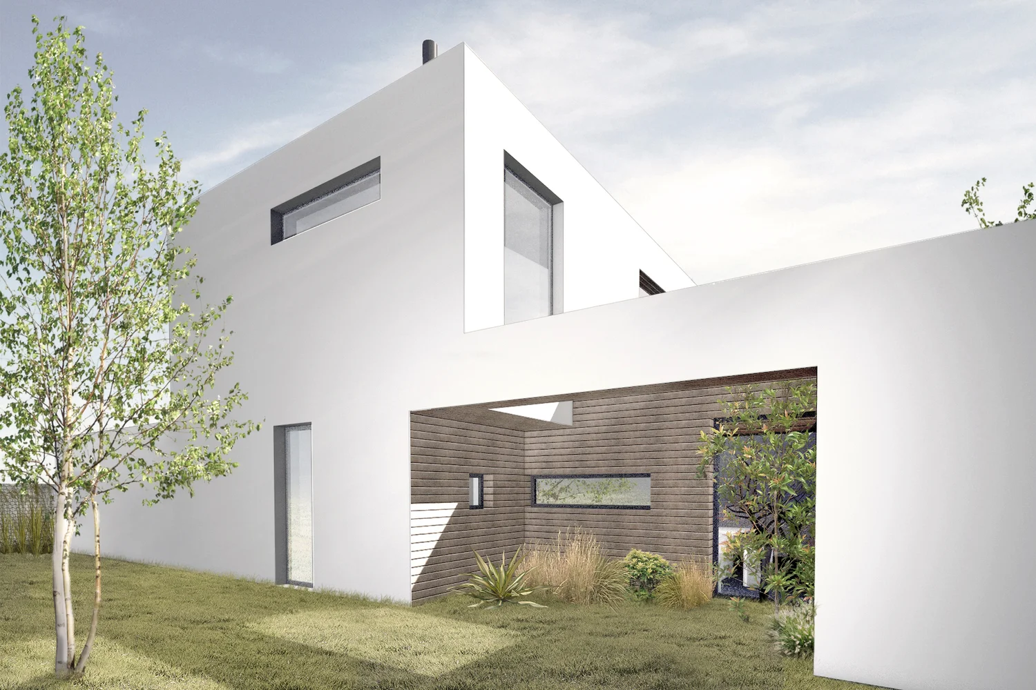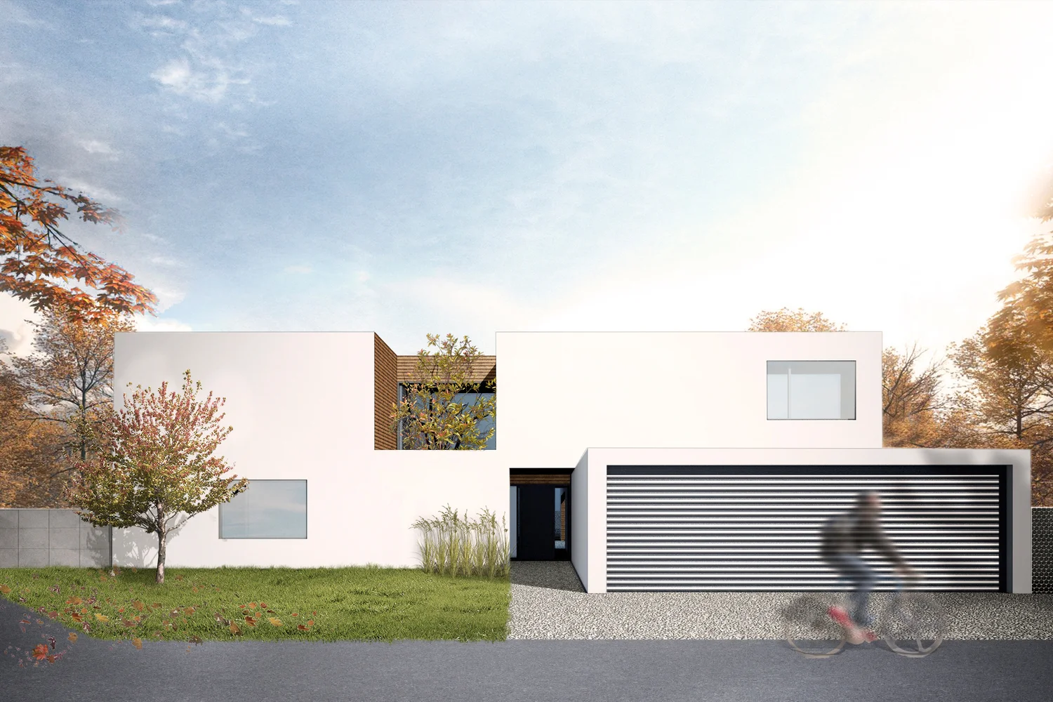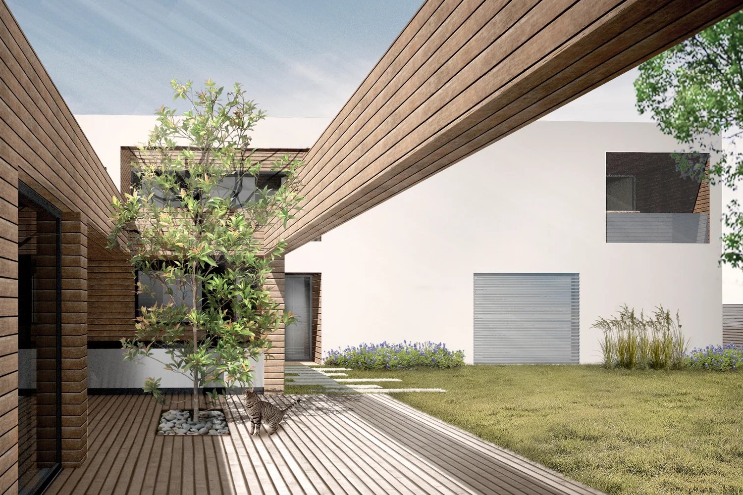 Na začiatku sme vytvorili jednoduchú hmotu domu v tvare písmena T, ktorá nám umožnila ideálne rozmiestnenie funkcií na danom pozemku - vzhľadom na životný rytmus rodiny, slnko, výhľad a okolitú zástavbu. Následne sme začali vytvárať „patia“ – vyberať hmoty domu a nahrádzať ich zeleňou a slnkom v miestach, kde to dáva zmysel. V koncepte je veľmi dôležitá trojrozmerná práca s vnútorným priestorom domu – vytváraním átrií vznikajú zaujímavé priehľady, prieniky denného svetla a slnečných lúčov, prekvapivé momenty pri pohybe v dome. Vnútorné patia umožňujú rôzne formy pobytu v exteriéri, pričom hranice medzi vnútornými priestormi a záhradou sa stierajú. Príkladom sú - letná kuchyňa, stolovanie pod stromom, či kreslá pri vonkajšom krbe, poobedňajšie slnenie sa na logii v detskej zóne, alebo severné kuchynské patio.